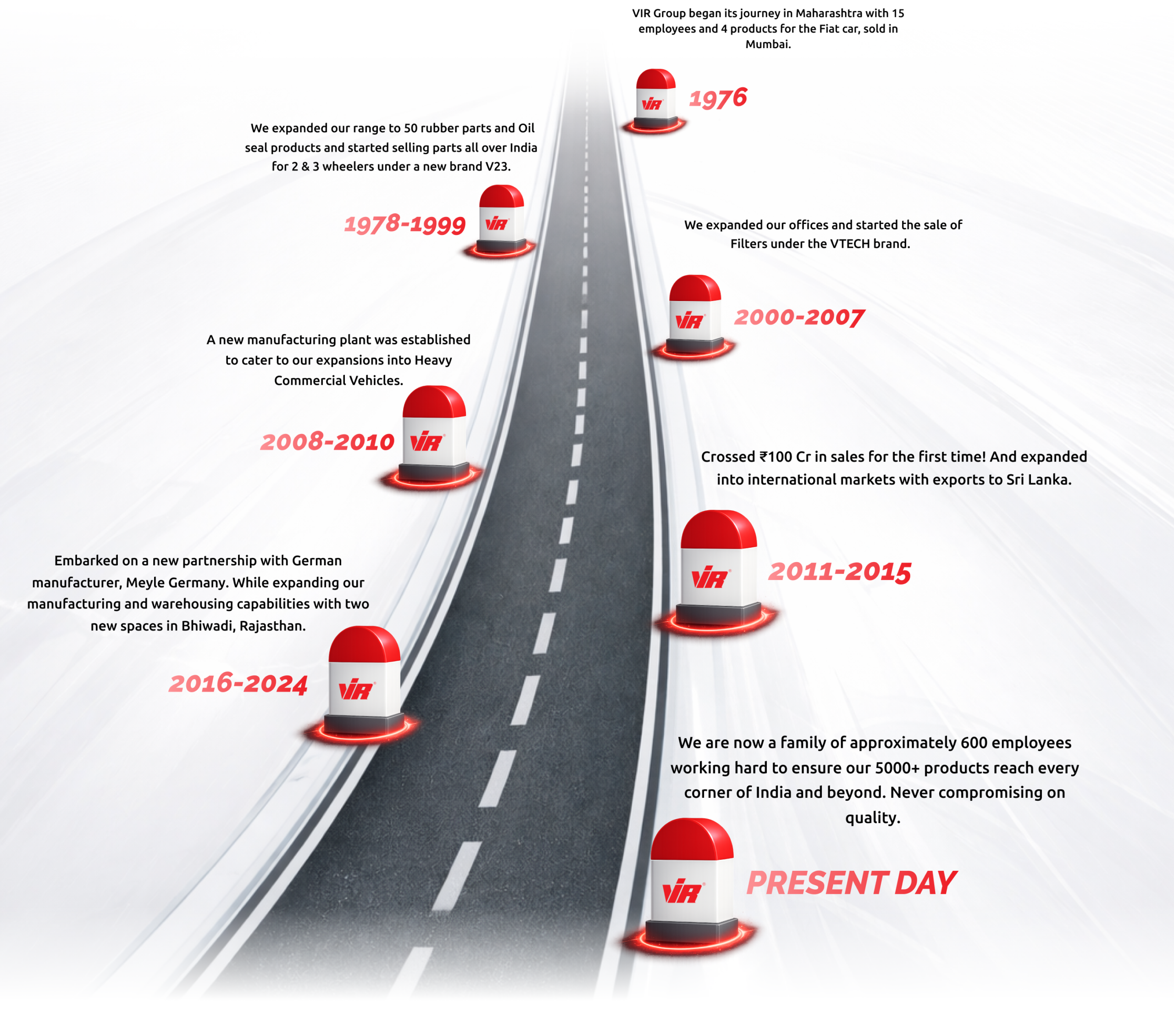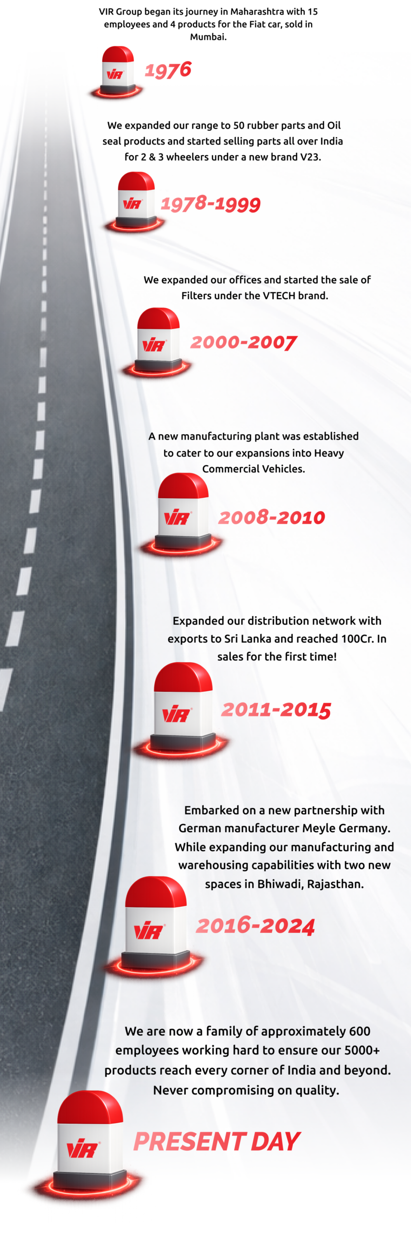 Established in 1976, VIR Group is a diversified automotive components manufacturer and distributor with a strong pan-India presence, offering a wide range of aftermarket products. The VIR brand specializes in rubber components, oil seals, and hose pipes; VTECH provides filters, water pumps, steering, suspension, braking parts, lubricants, and more; while V23 serves the two- and three-wheeler segment. The Group operates advanced manufacturing facilities following global quality standards, lean practices, Industry 4.0 benchmarks, and SAP-enabled traceability. Supported by two mother warehouses and a nationwide network of 500+ distributors and 1,000 dealers, VIR Group continues to drive innovation through its ultra-modern North India facility and technical collaboration with MEYLE, Germany.